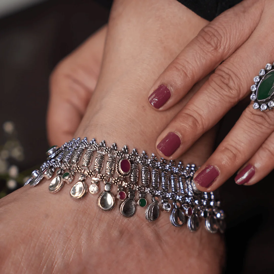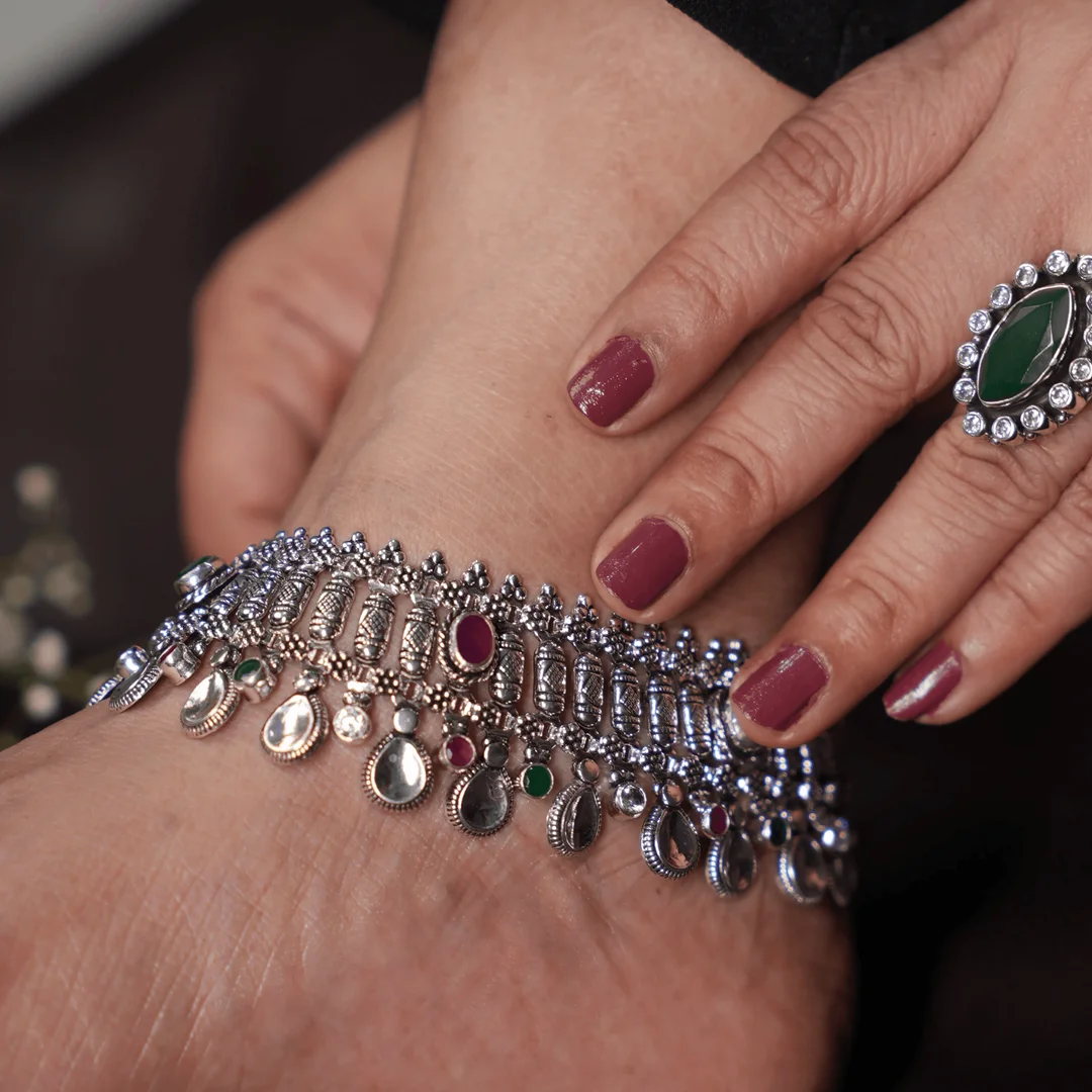 Thick silver bridal payal with rich bell patterns and hanging stone beads.