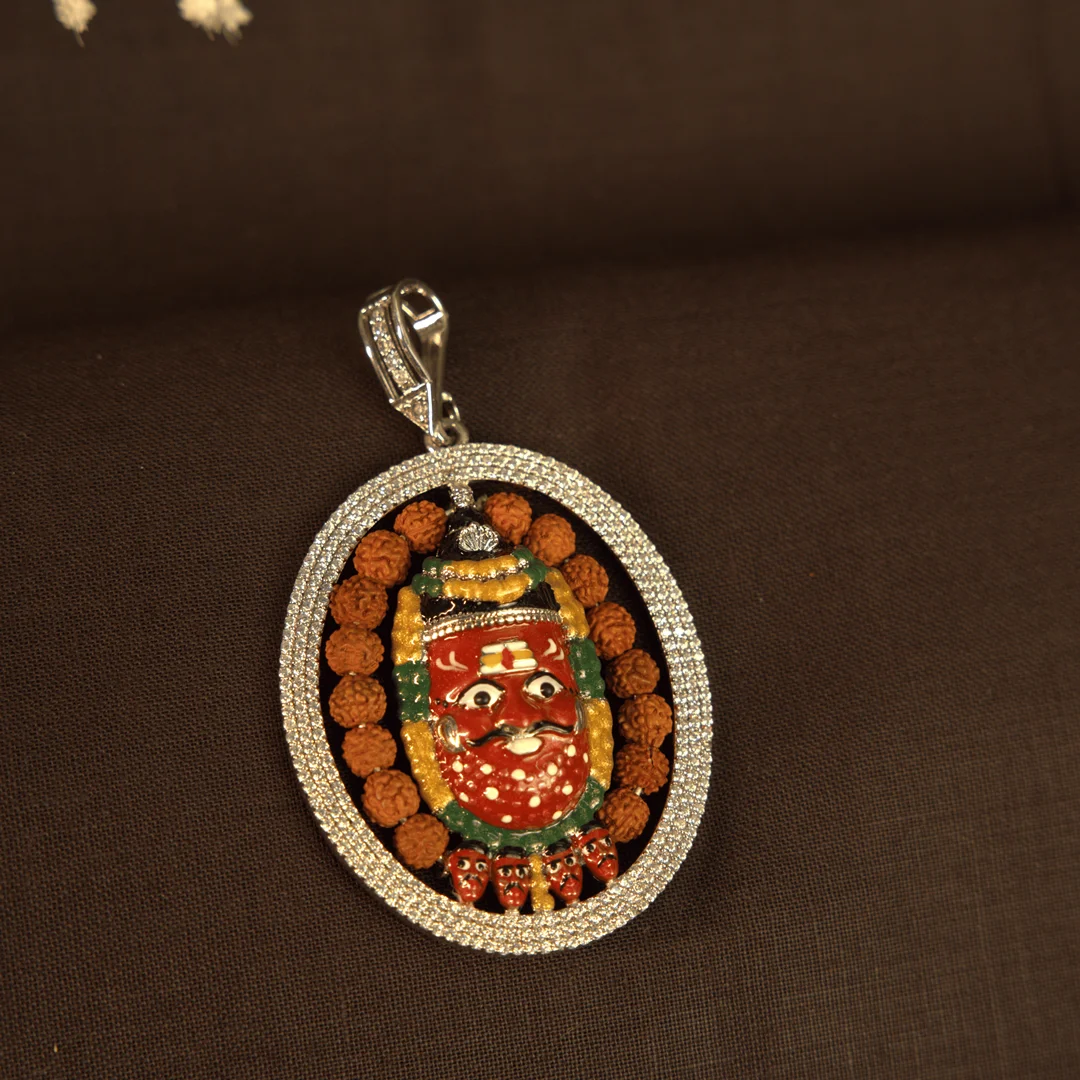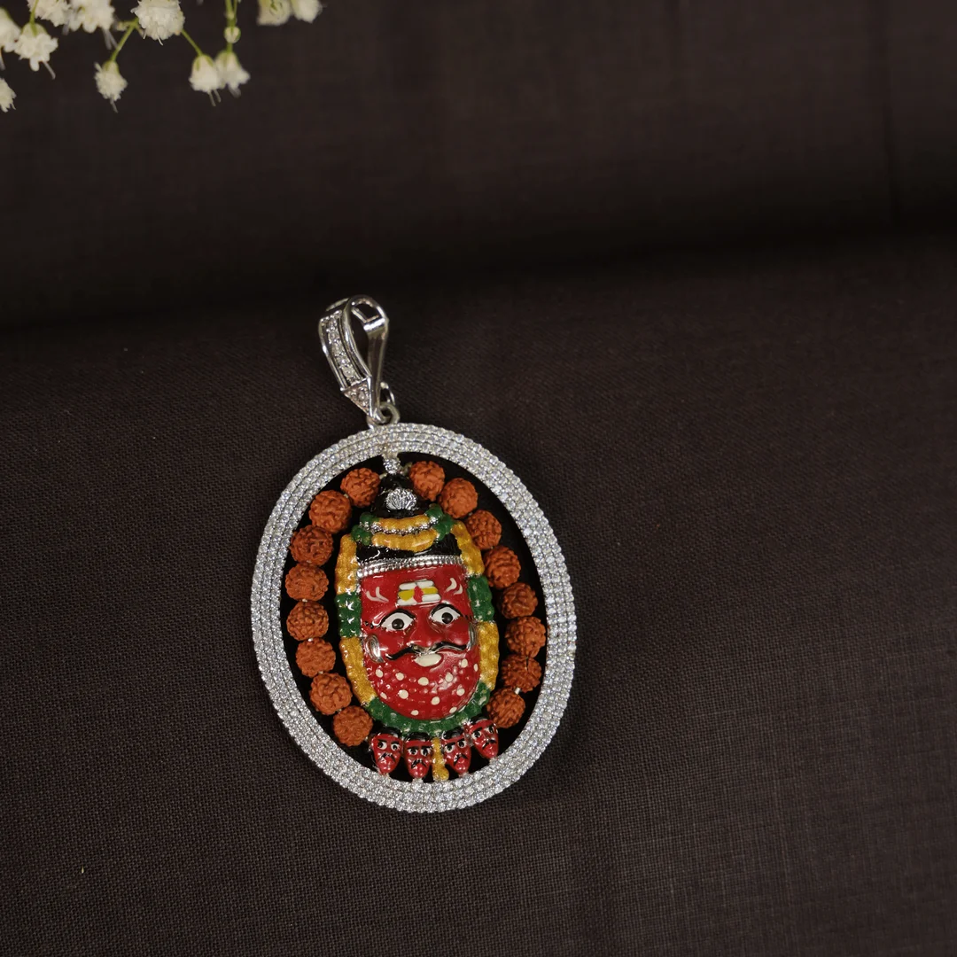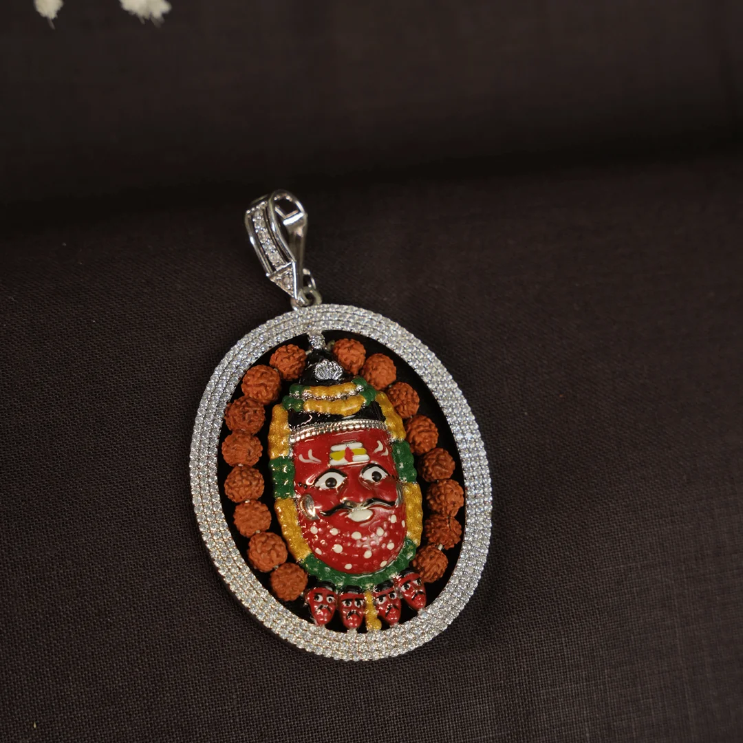 • Design Elements: Surrounding rudraksh mala + triple silver chain layers
