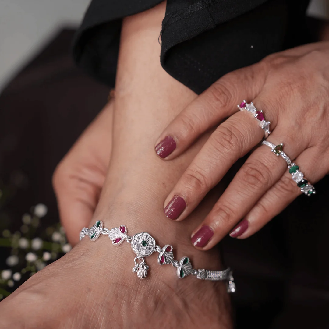 Add color to your traditional outfit with this pure silver payal featuring small floral motifs studded with pink and green stones. Set on a fine antique-style chain, it adds both shimmer and tradition to any ethnic ensemble.