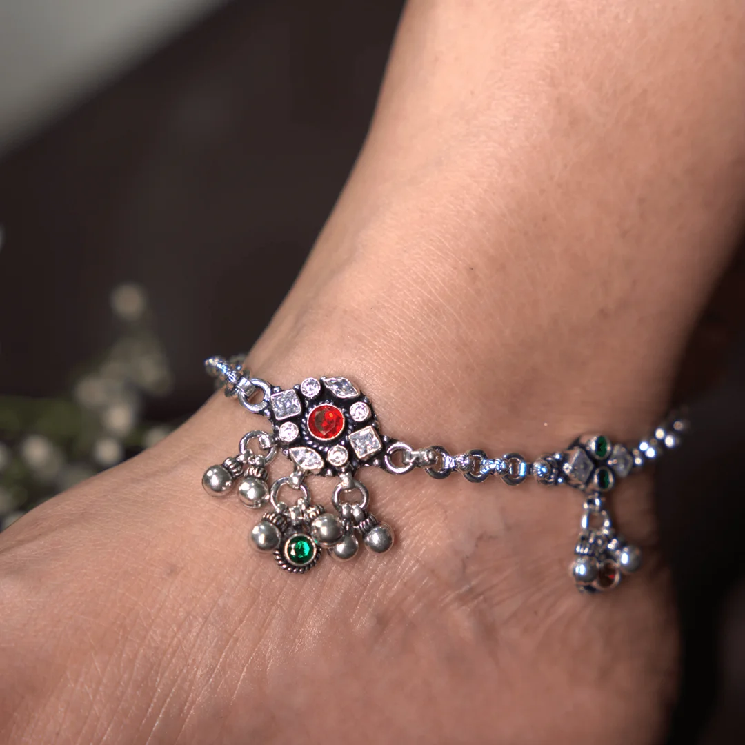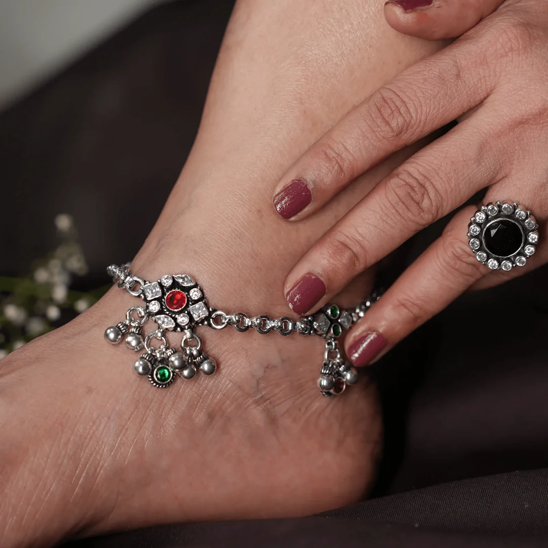 With multi-hued flowers strung along a sleek chain, this silver payal dances with vibrant charm. Each floral unit hangs freely with a soft ghungroo below, creating gentle music as you walk.