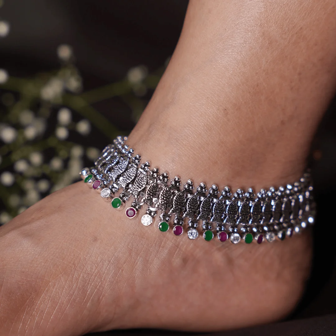 Temple-style silver payal with traditional elements and colorful diamond-style insets.